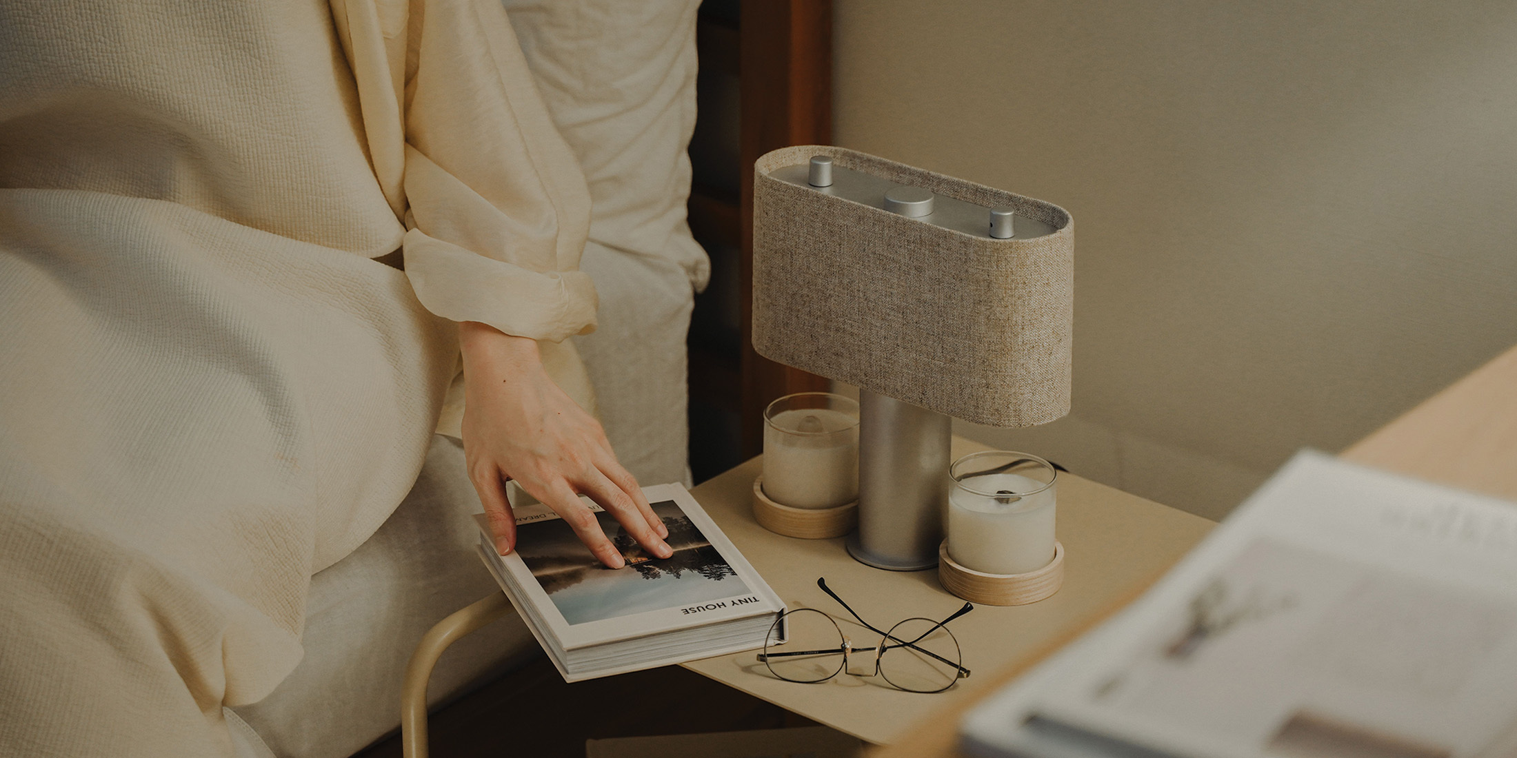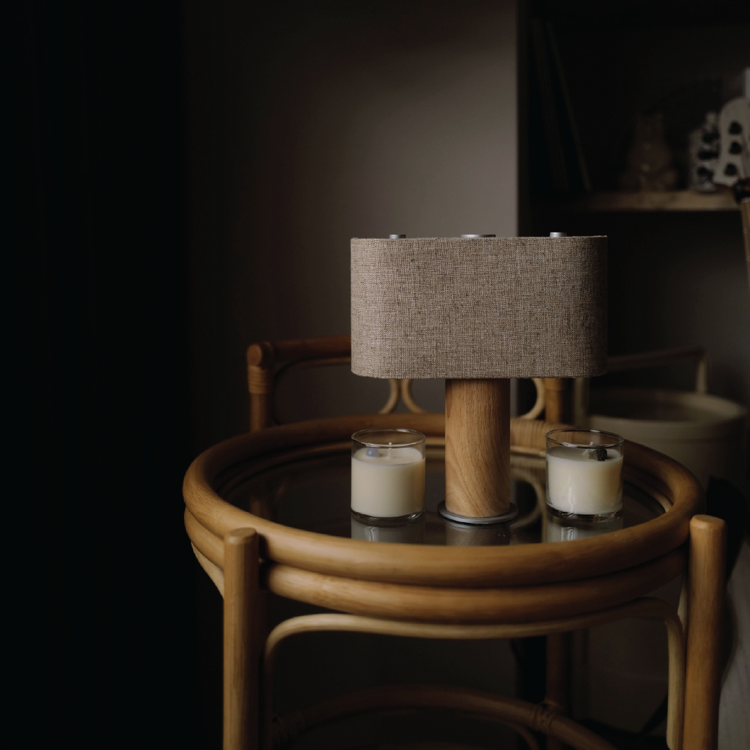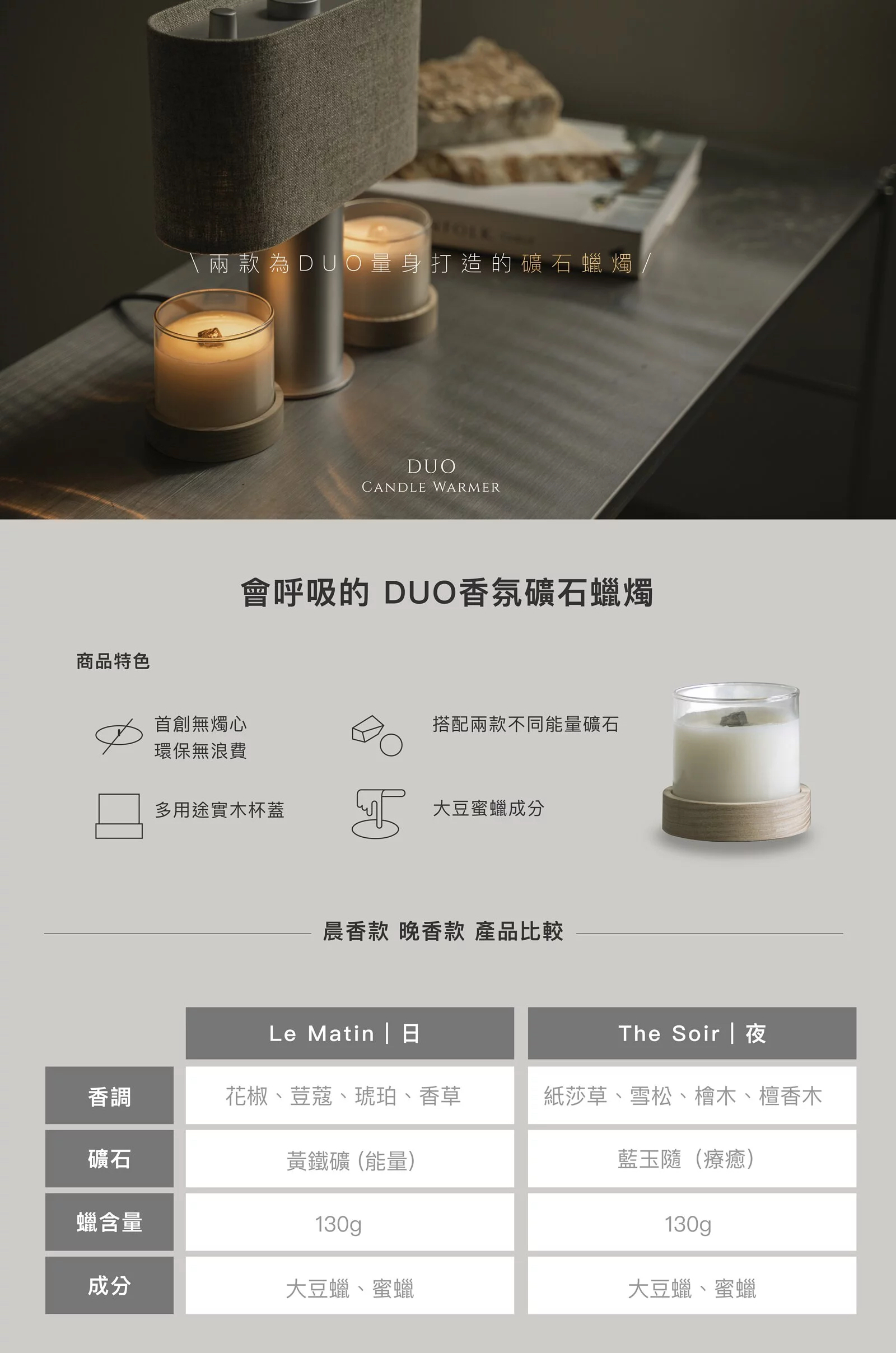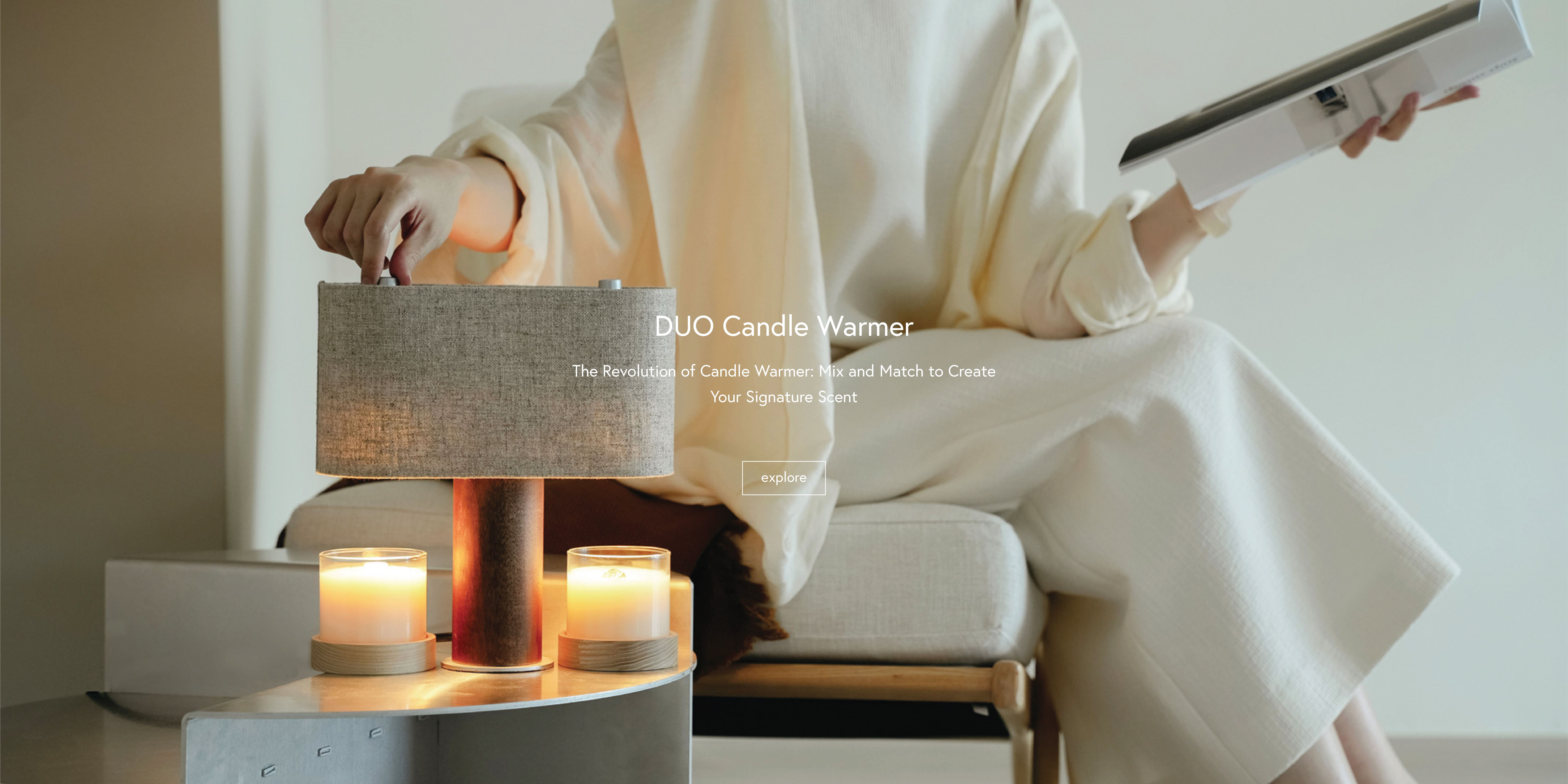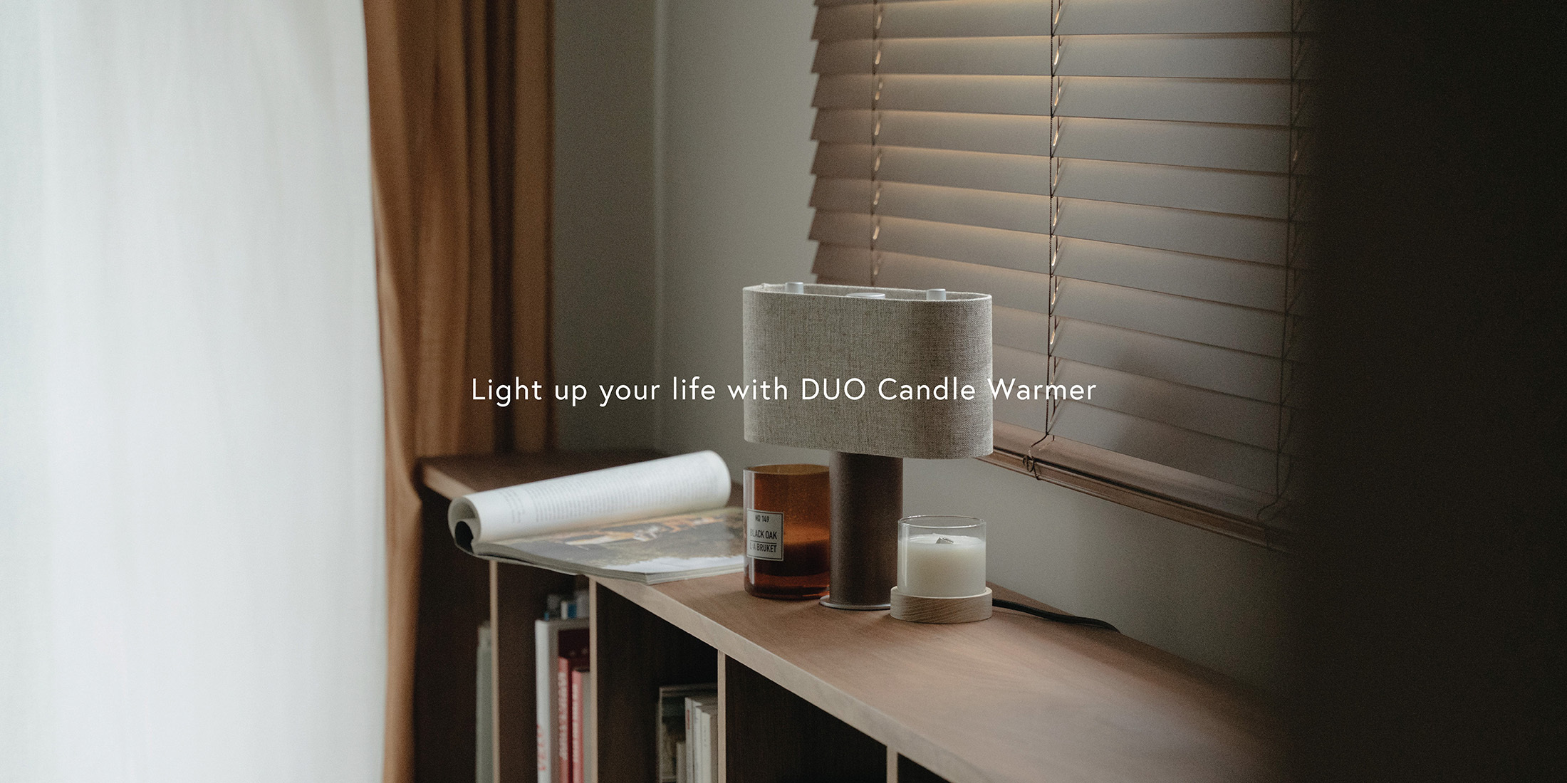 DUO混香融蠟燈將光和熱收進織品裡,運用光產生熱能融化蠟燭散發氣味,也透過織品散發的微光,讓光沒有界線,而是氛圍;如同氣味一般,沒有界線就進入生活般自然。從此不再擔心懸浮粒子,不再被熄掉的煙嗆到,沒有燒不完全的蠟,只有餘韻延續的美好感受。