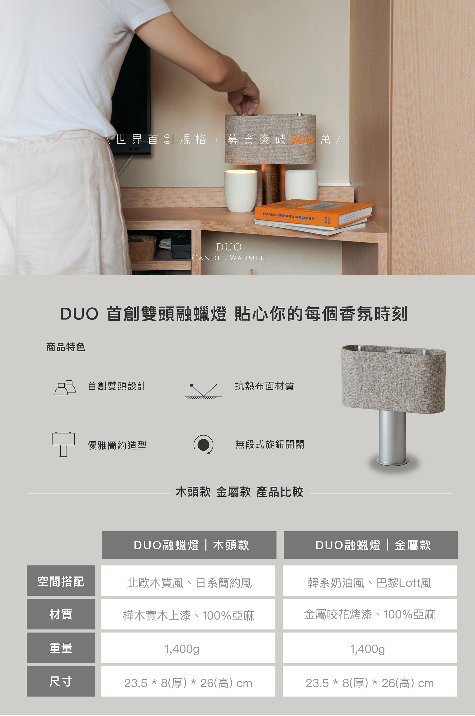 KIMU以設計燈具的高規格與創新思維,打造你沒看過的融蠟燈,擁有專利的DUO雙燈頭,1加1更大於2,想白天晚上切換香氣,想調香,每天想來點不一樣的,DUO都幫你設計好了。不只升級你的儀式感,更增添細緻再升級,貼心駕馭你所有香氛時刻,讓每天都不一樣的挑惕嗅覺服服貼貼。