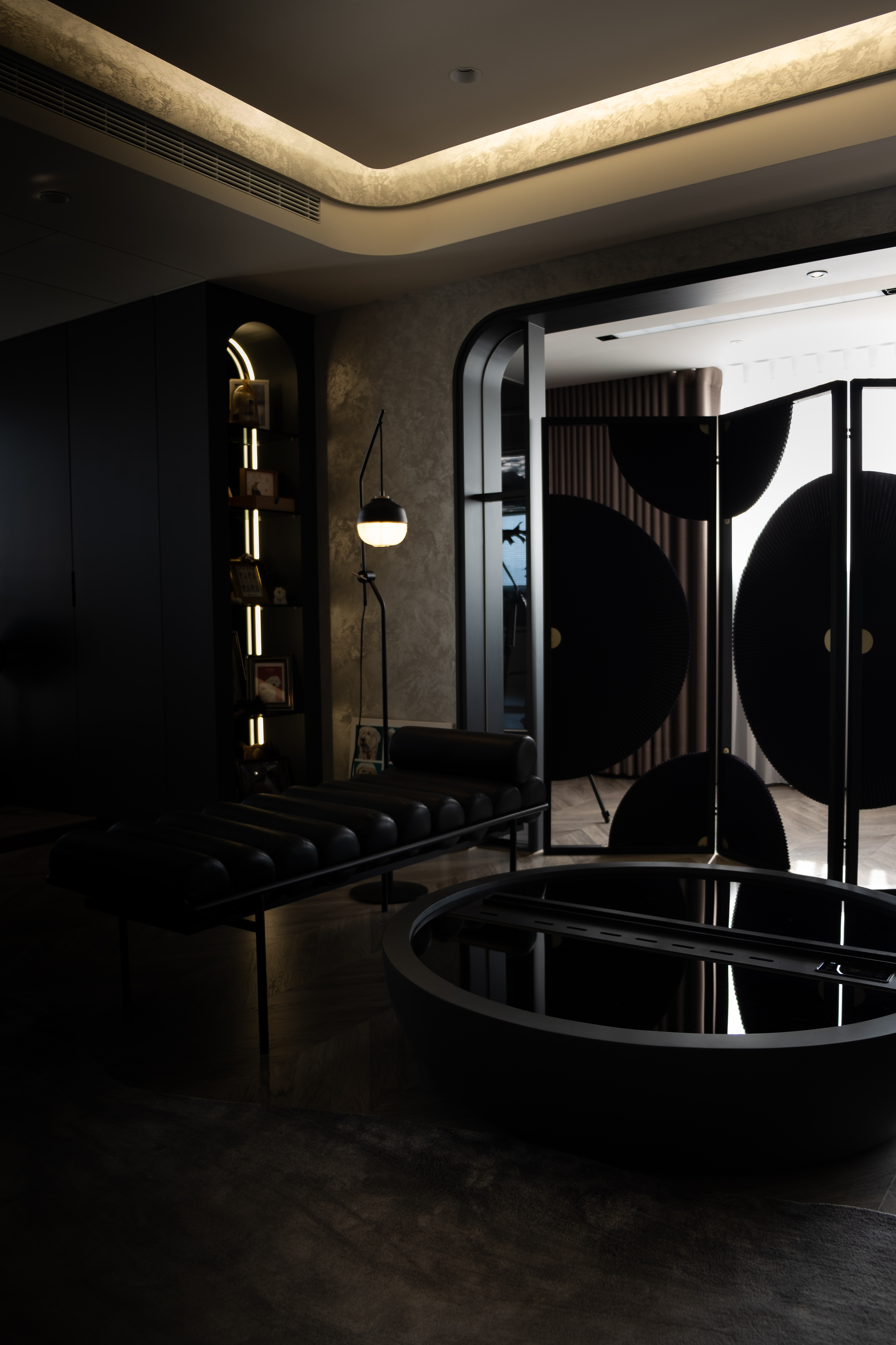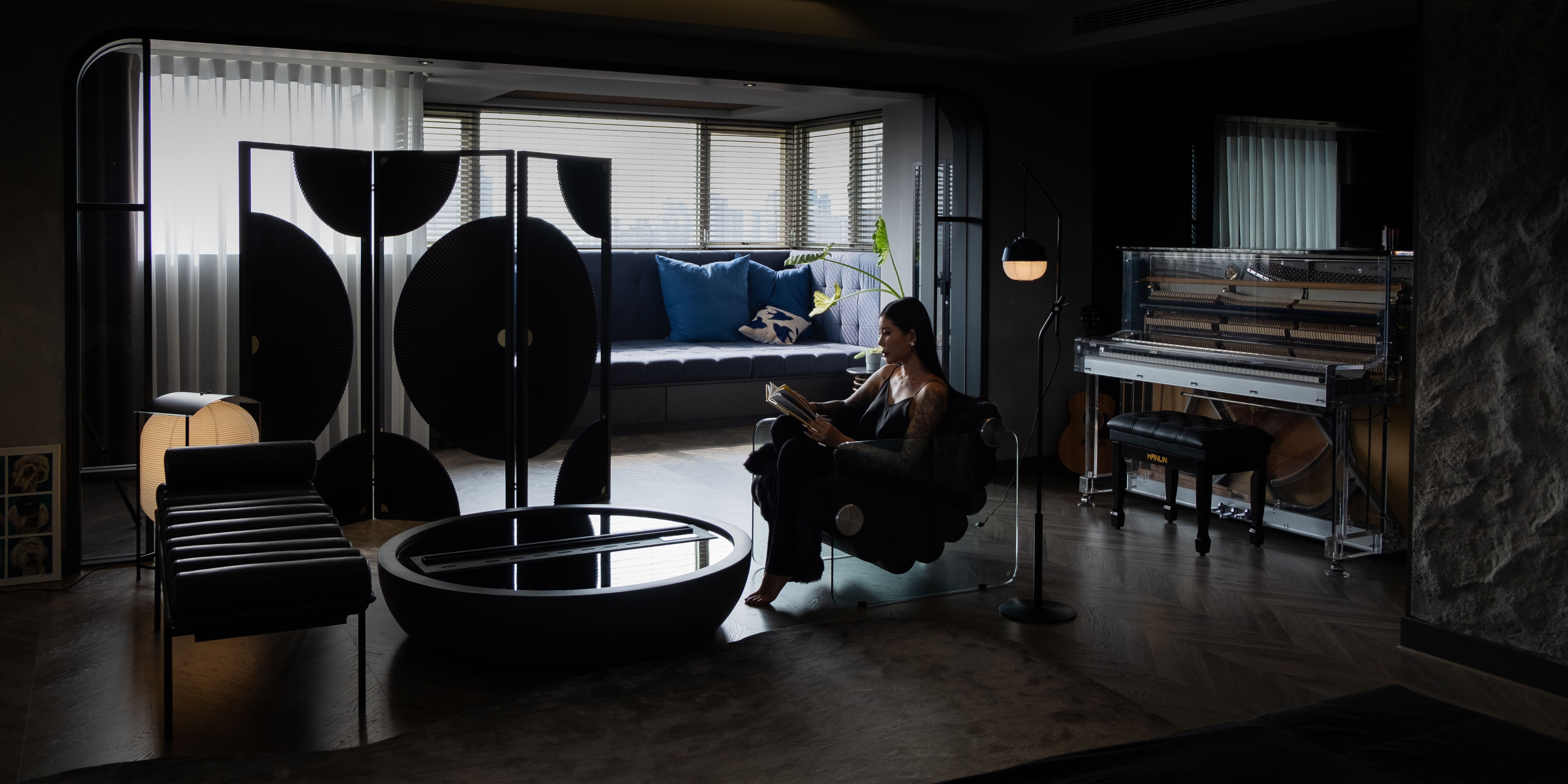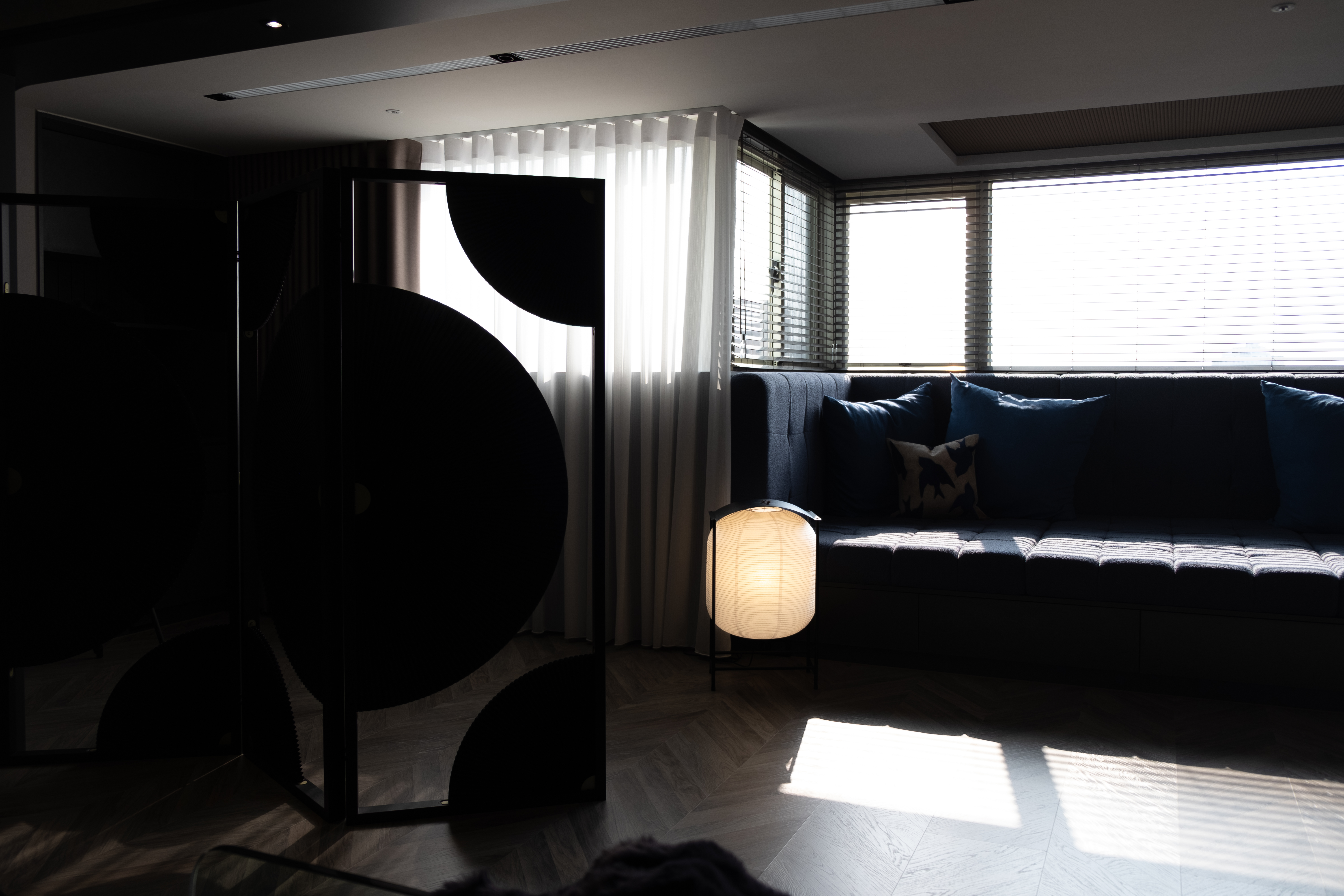 在透過扇變屏風半穿透式設計所營造出的光影空間中,無論是以一盞東西立燈搭配單人座椅或躺椅,都是每日me time時刻最好的角落。在這個私密的角落裡,百百能夠完全放鬆身心,遠離外界的喧囂與壓力。讀書、思考,或者僅僅是閉上眼睛沉浸在寧靜的氛圍中。而一盞東西立燈的柔和照明,營造出溫暖、安靜的氛圍,使得這個角落成為她尋找靈感和內在平靜的理想去處。喜歡下廚的百百生動地以食材搭配來比喻:「明明有時髦俐落的外型,但怎麼又有東方味的靈魂,這個對比強烈卻融合,應該就像燻鮭魚上面搭配的酸豆一樣吧!」