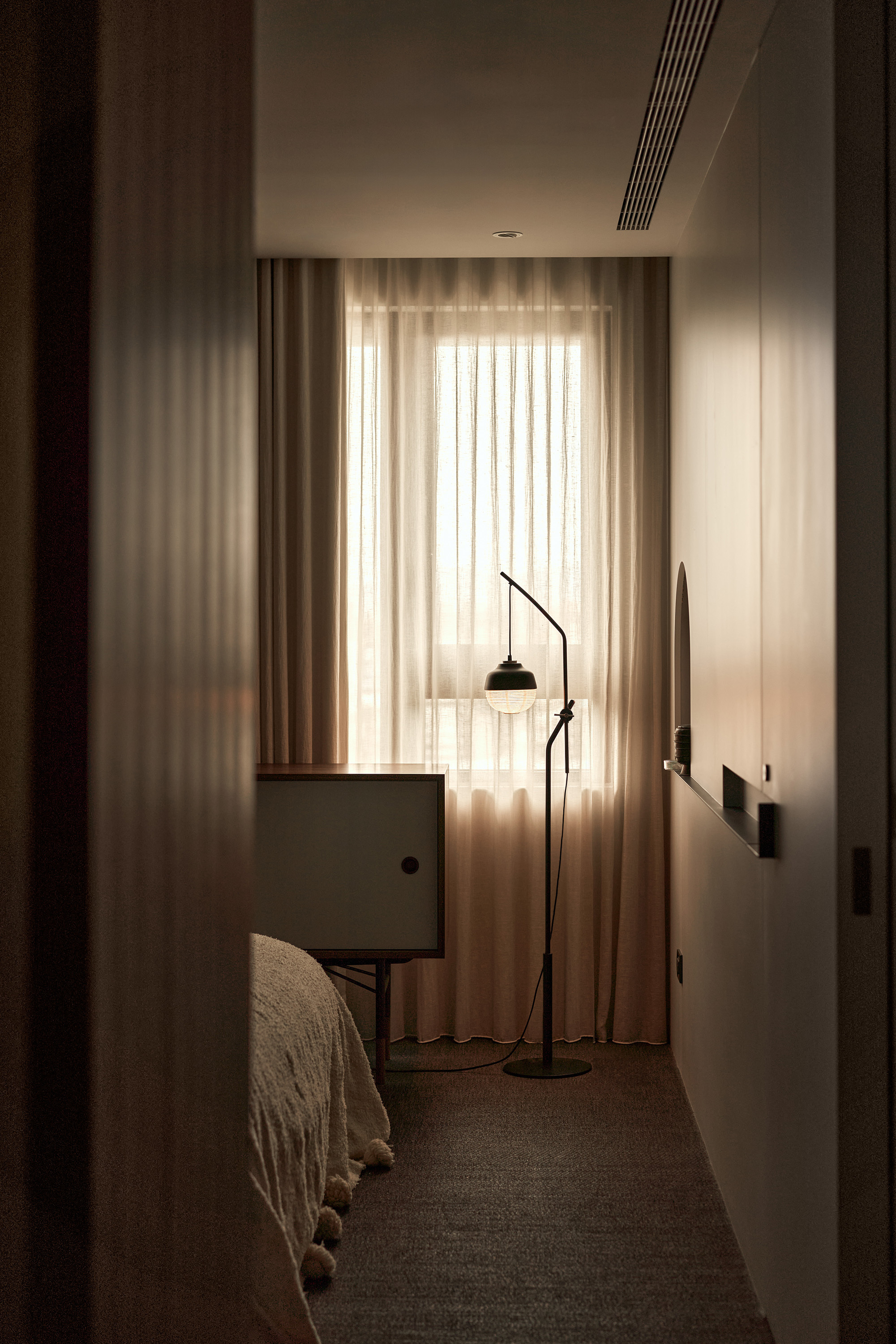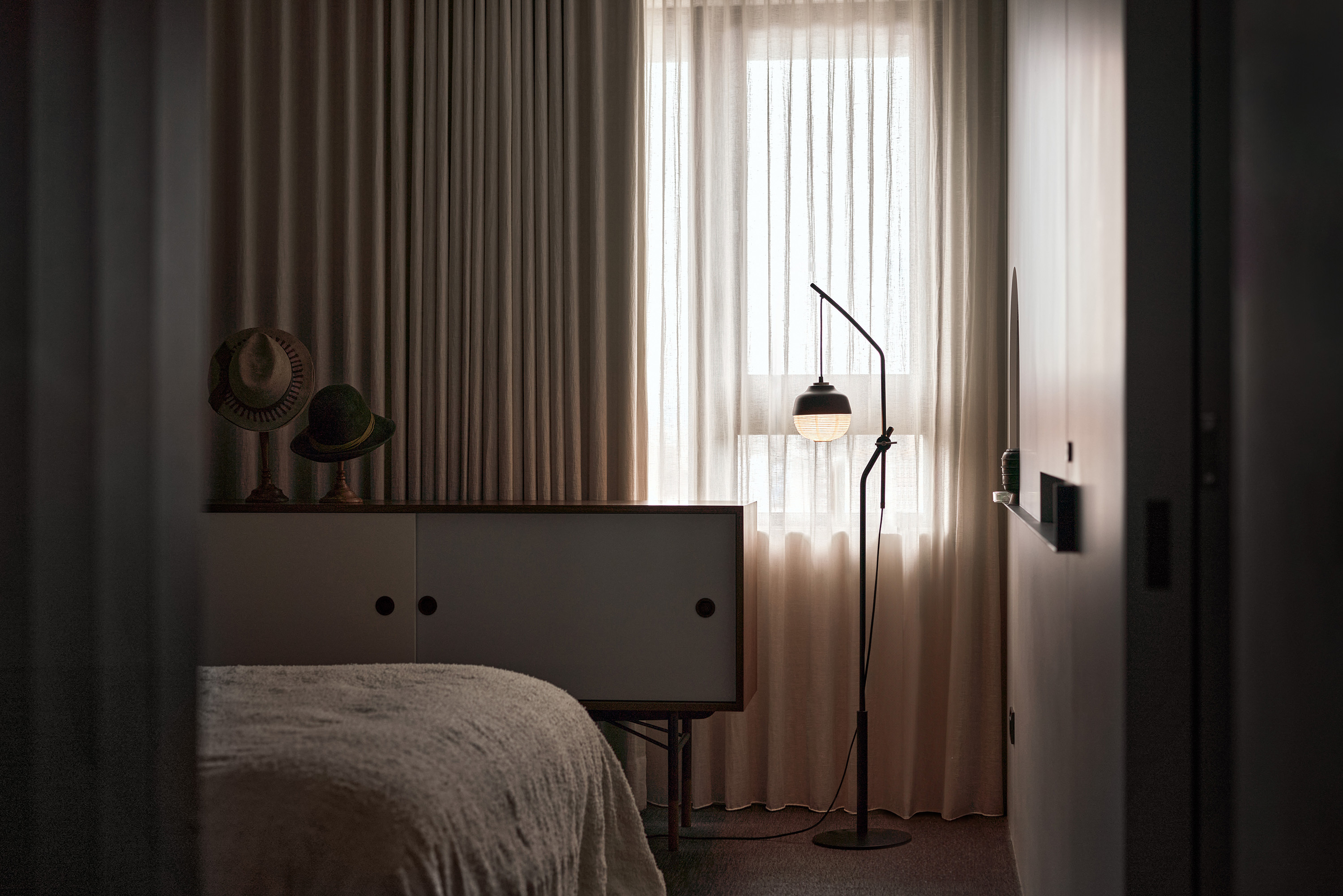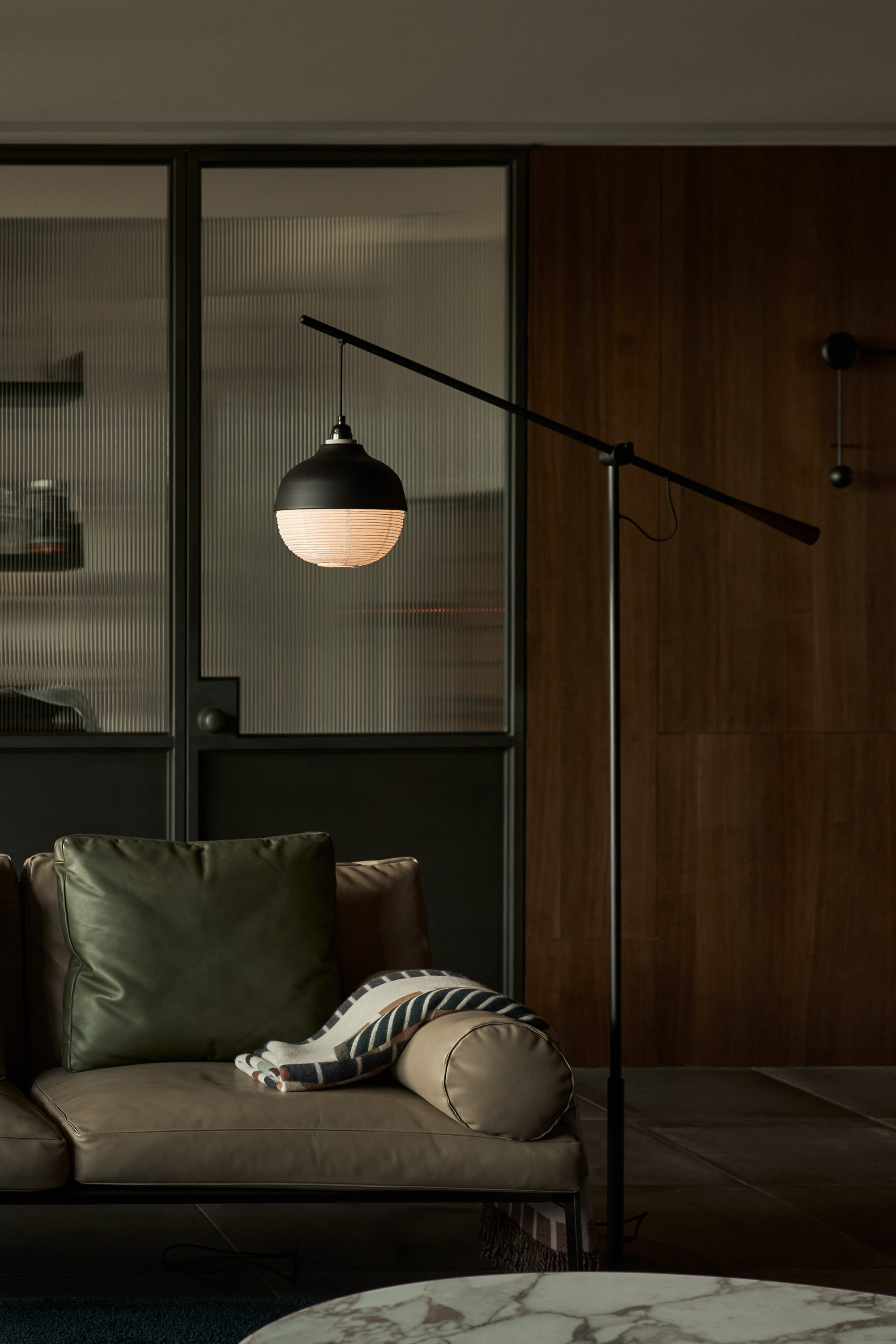 一盞東西立燈在這個Japandi風格的空間中,完美展現了東西融合的設計語言。立燈簡約的幾何造型與黑色金屬結構,呼應了北歐風的極簡美學,而紙材燈罩帶來的柔和光線,則融入日式禪意的溫潤與靜謐。擺放在沙發旁,它既提供實用的局部照明,又成為空間中的設計焦點,凸顯細節的質感。同時,立燈的可調節燈罩設計,為這個融合自然與現代的空間增添了靈活性,讓每一處角落都能擁有適宜的光影氛圍,展現了Japandi空間的和諧與精緻。
