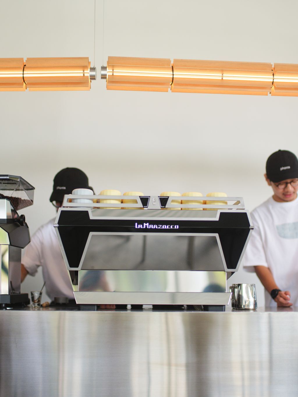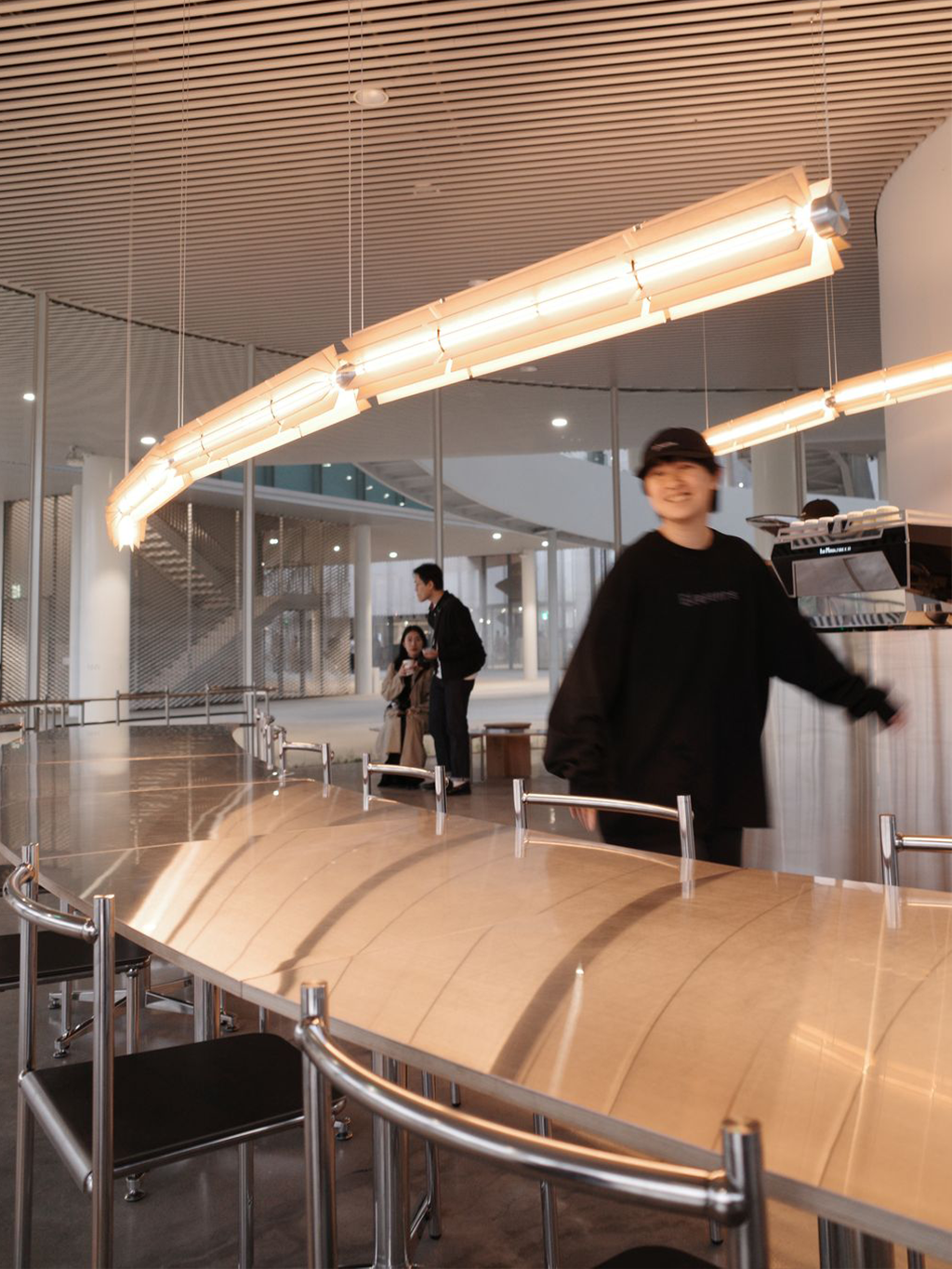 在工業感強烈的吧檯之上,這份規律排列的暖光,為妹島式建築的「白」注入了充滿詩意的靈魂。
