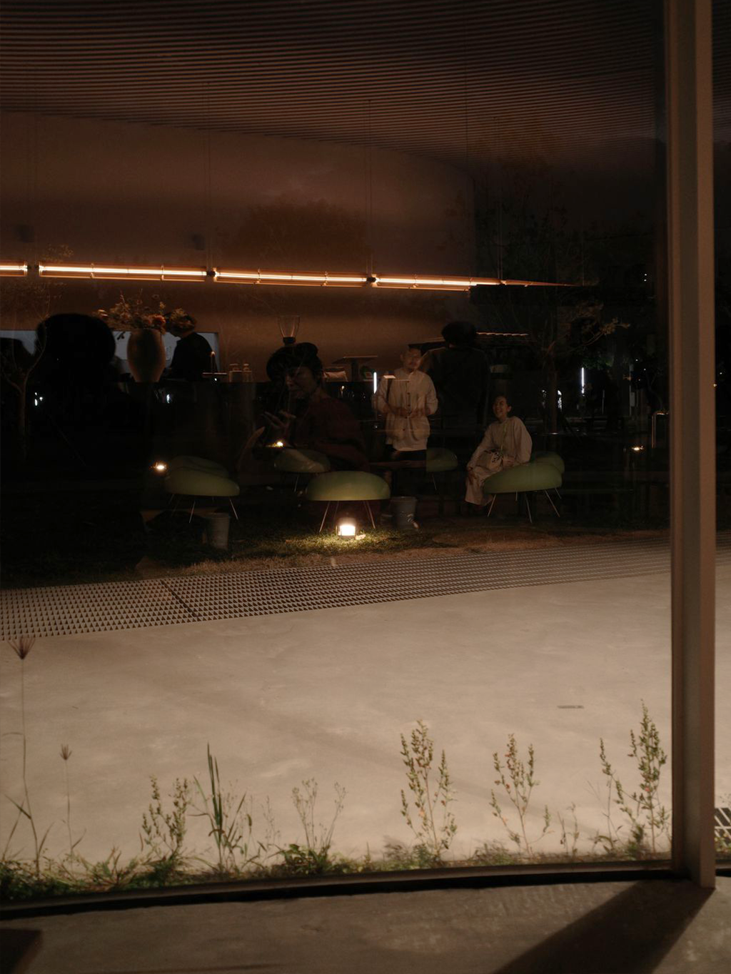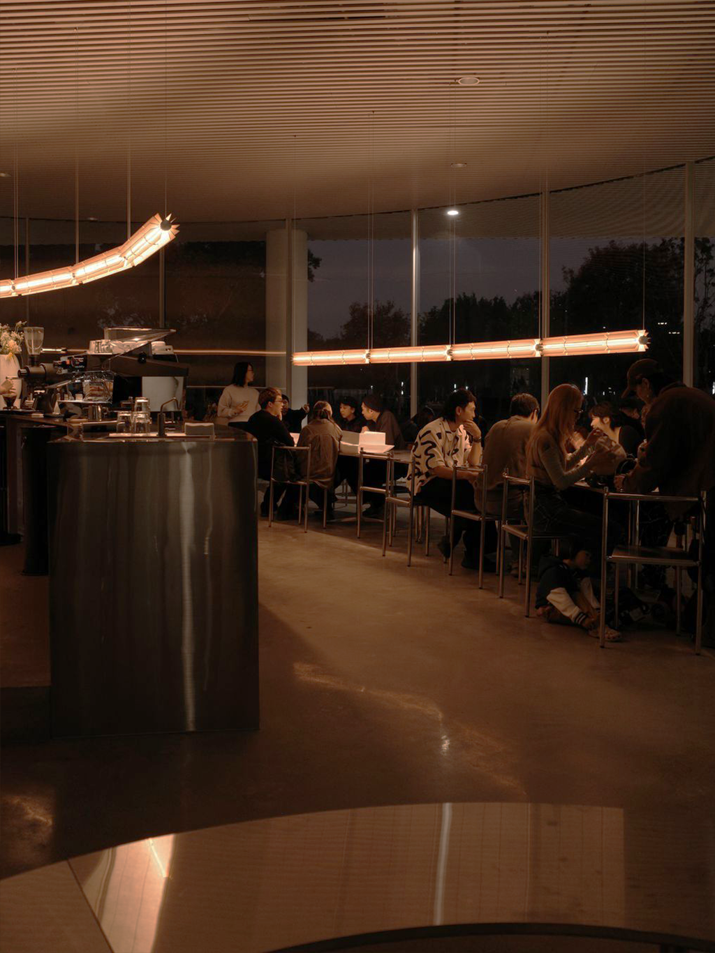 當妹島和世那標誌性的白色建築隱入夜色,Pharos 咖啡就變成了一座發光的透明容器。柒木的糖蔥燈成了主導空間氛圍的主角。