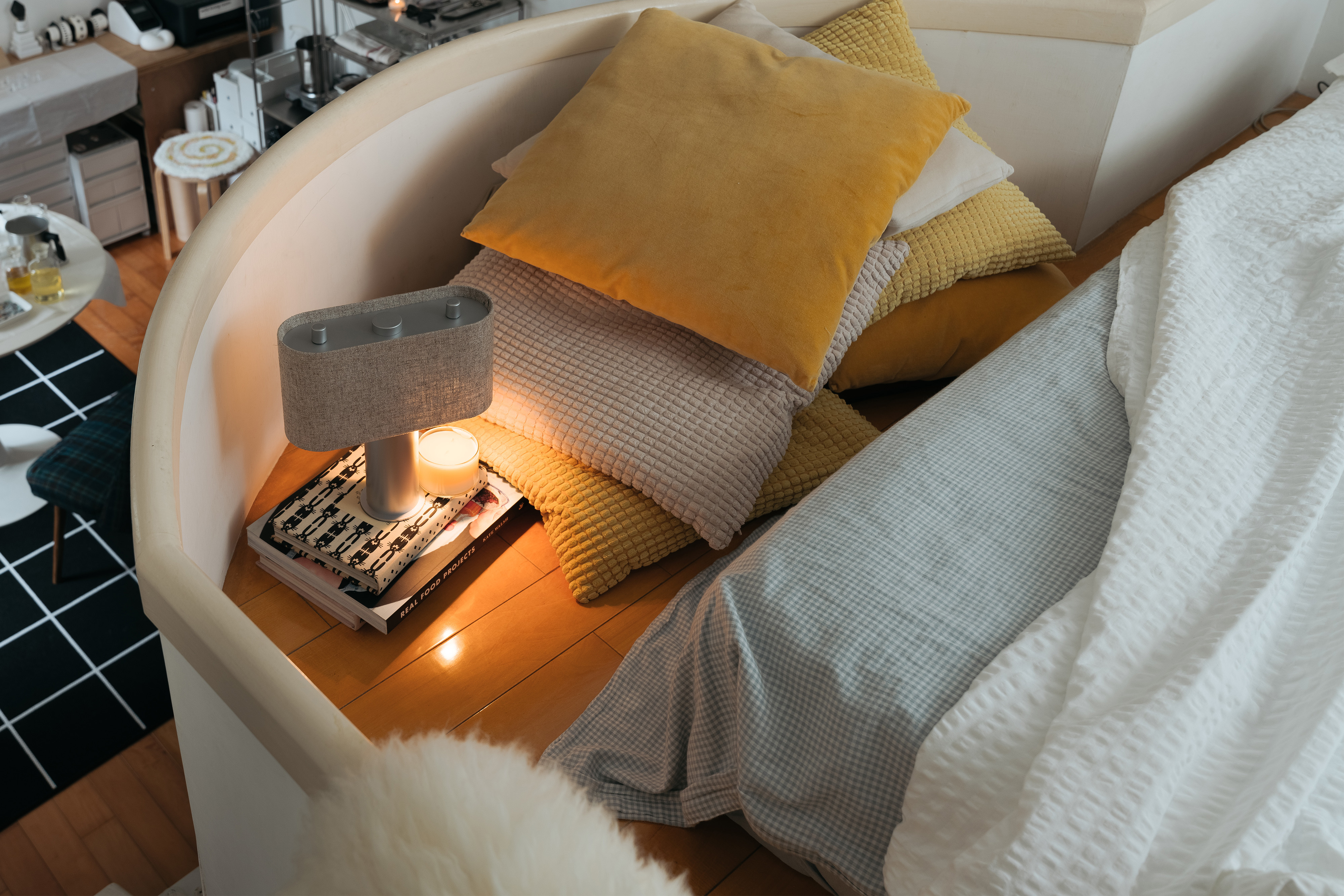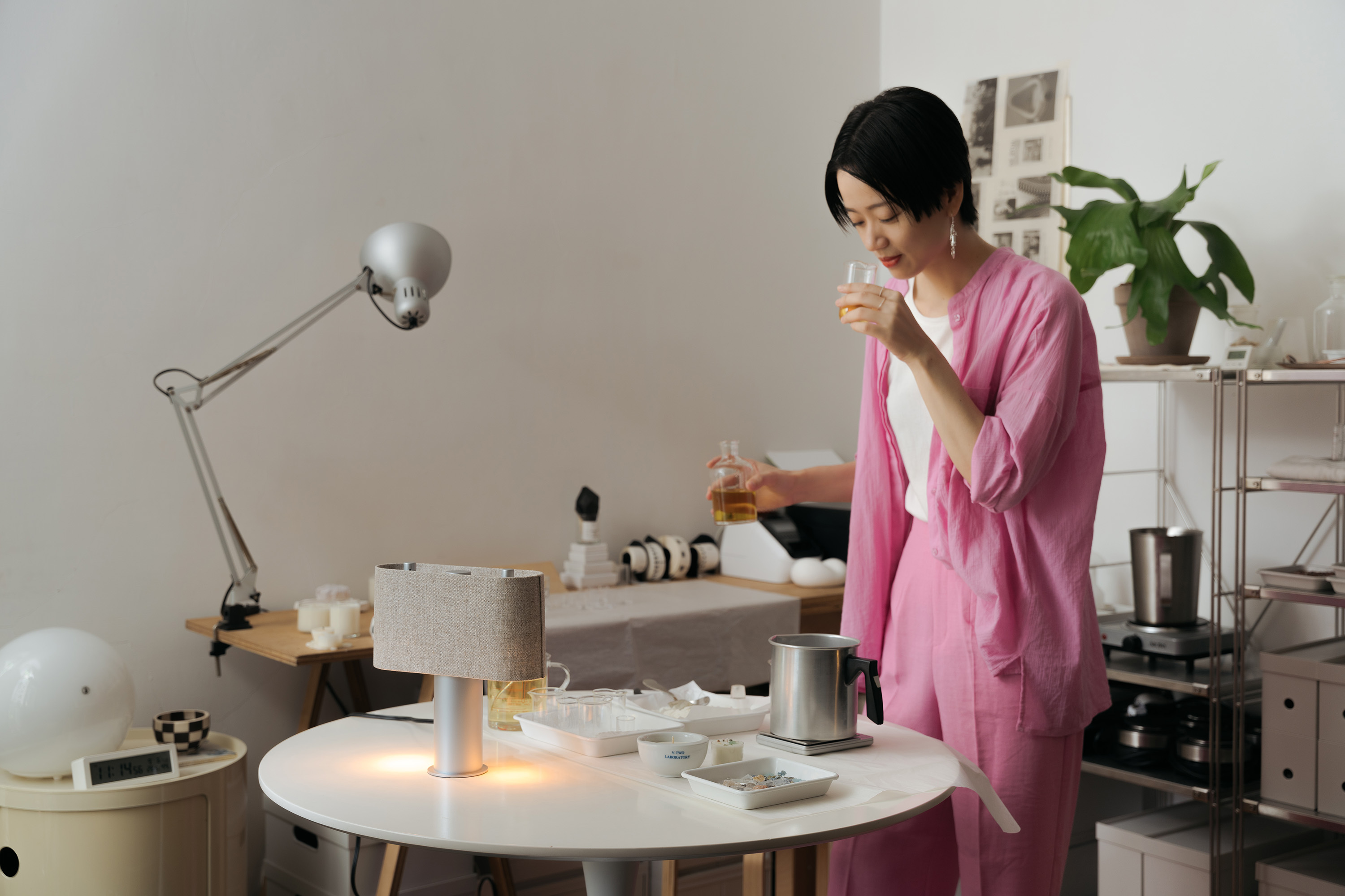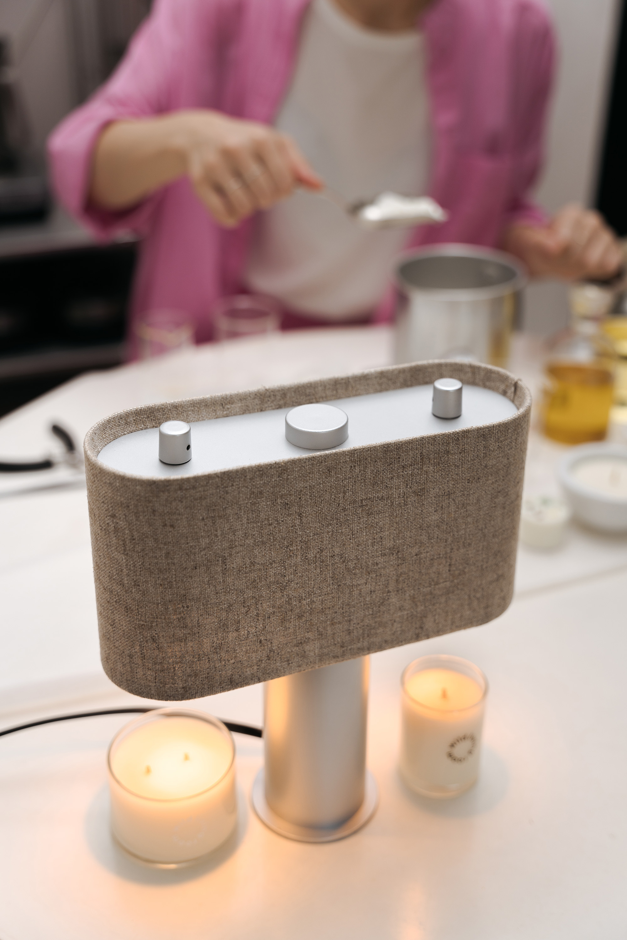 「我是一個對氣味很敏感的人。」DUO融蠟燈利用雙燈頭的混香功能,將氣味的自由、實驗性與主觀等抽象特質有感化,提供使用者一個展現創意的舞台是最吸引MU的地方。很多人會問我有沒有什麼調香的訣竅,我認為就是打開自己的感官去體驗各種嘗試,從過程中找出最適合自己的味道。MU對於DUO將早期的布燈罩桌燈以現代極簡的方式轉化也感到驚喜。「雖然放在現代的空間中,卻依然可以感受到昭和時期日本咖啡廳散發出的煙燻復古氣息。」