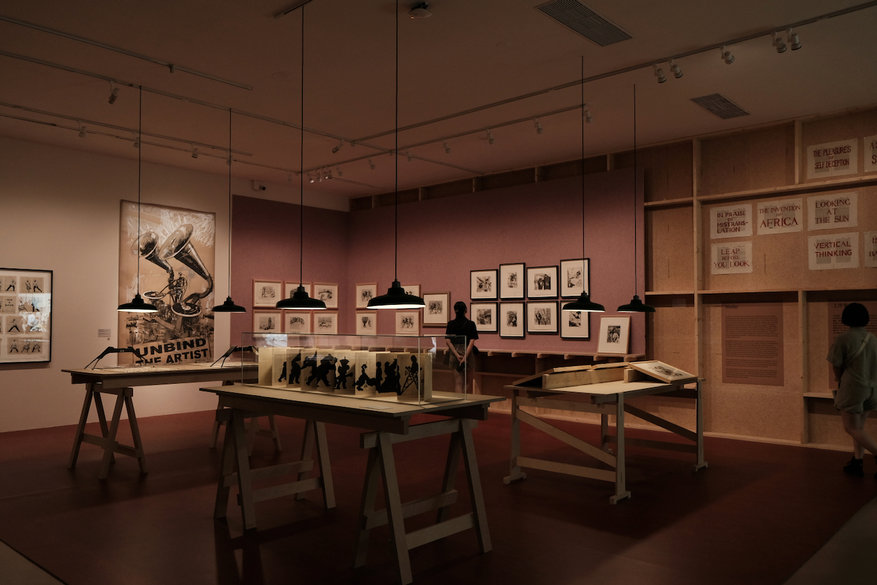 素描是肯特里奇創作過程中的核心手法,他靈活運用各種媒材進行素描創作,包括紙上的鉛筆素描、墨水、牆上炭筆塗鴉以及撕貼。他的作品展現了高度的即興性和直覺操作,素描對他而言是一種精神,也和他的思考融為一體。正如肯特里奇所說,素描不僅是繪畫「造型打底」的基礎,更是捕捉靈感運作過程中的心緒流變的媒介。