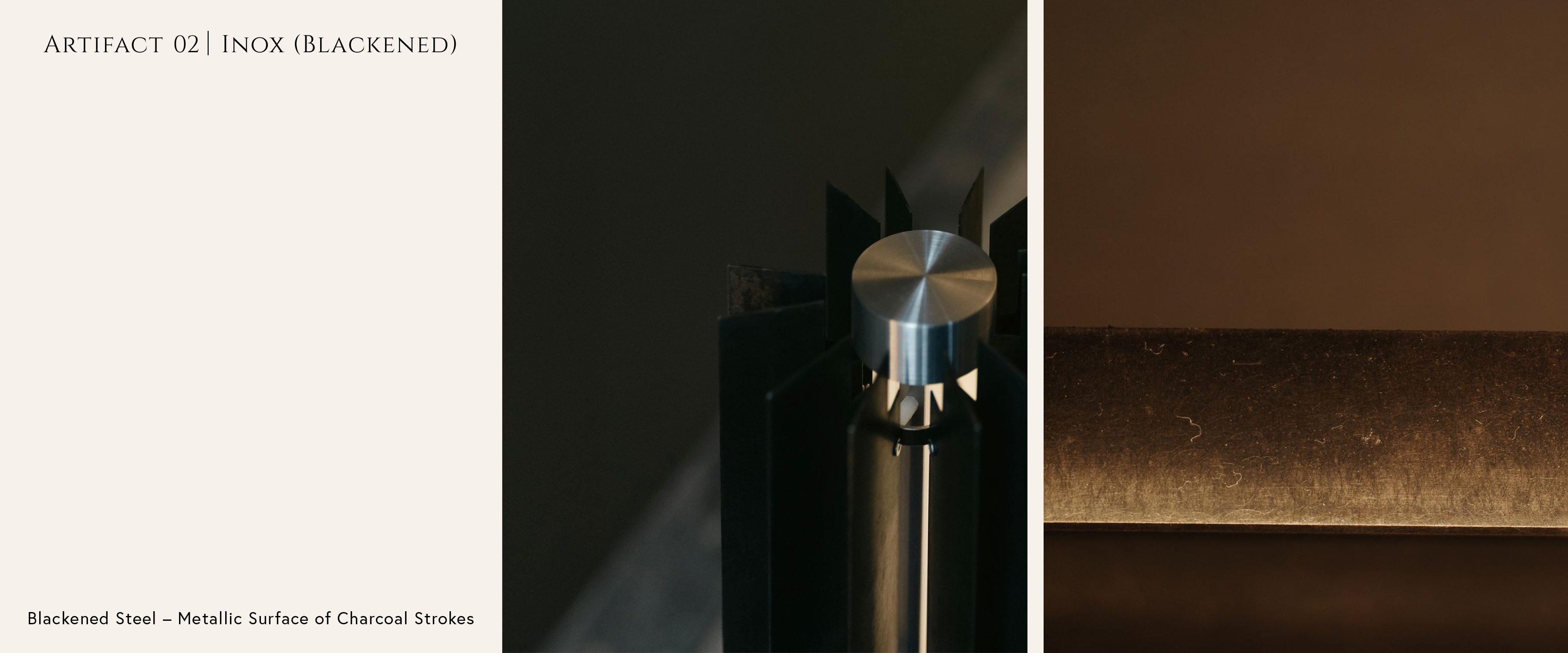 表面像是被炭筆反覆描繪的不鏽鋼,它的冷冽並非拒人於千里,而是一種自我收斂的姿態。此處,「黑」不僅是顏色,更是一種集體象徵的沉澱,將力量封印在不閃爍的反射裡。