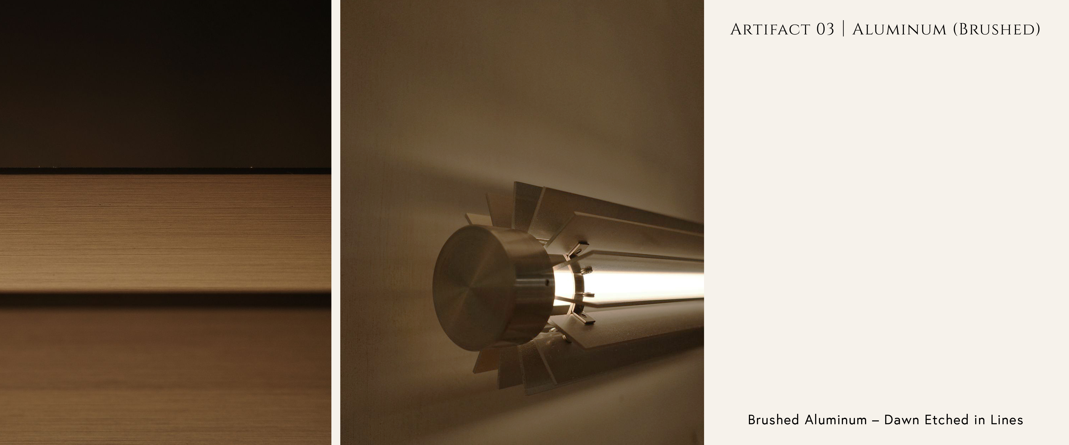 鋁表面的細密拉絲痕跡,不是自然生成,而是人為留下的刻痕。這些線條,既規律又綿延,彷彿文明的節奏被刻寫於表層。工藝是被投射在表面的可見秩序。